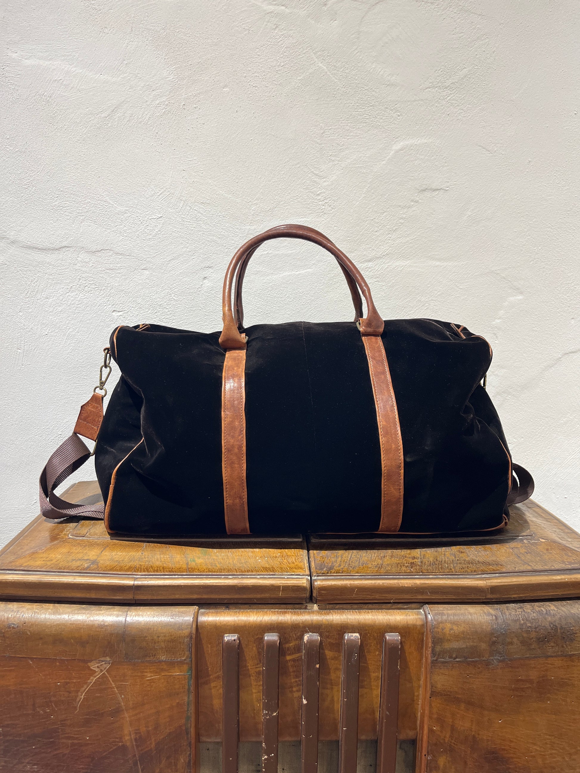 Borsone da viaggio su tessuto velluto liscio in cotone seta , rifinita con profili in pelle ovina e catena in ottone brunito.